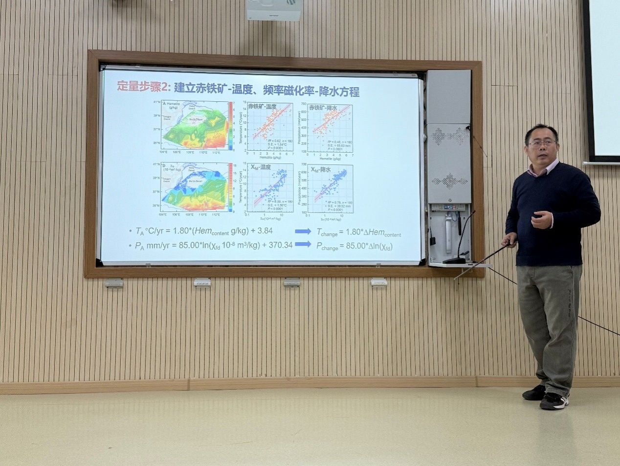 在区域气候变化方面,郝青振研究员重点介绍了基于黄土现代表土样品的磁性矿物与气候参数关联的研究,揭示出温度是控制赤铁矿形成的主要因素。研究进一步构建了赤铁矿—温度及频率磁化率—降水方程,定量重建了会宁剖面80万年以来温度和降水的演变过程,并预估在气温上升2℃的情景下,黄土高原地区降水将增加约100毫米。