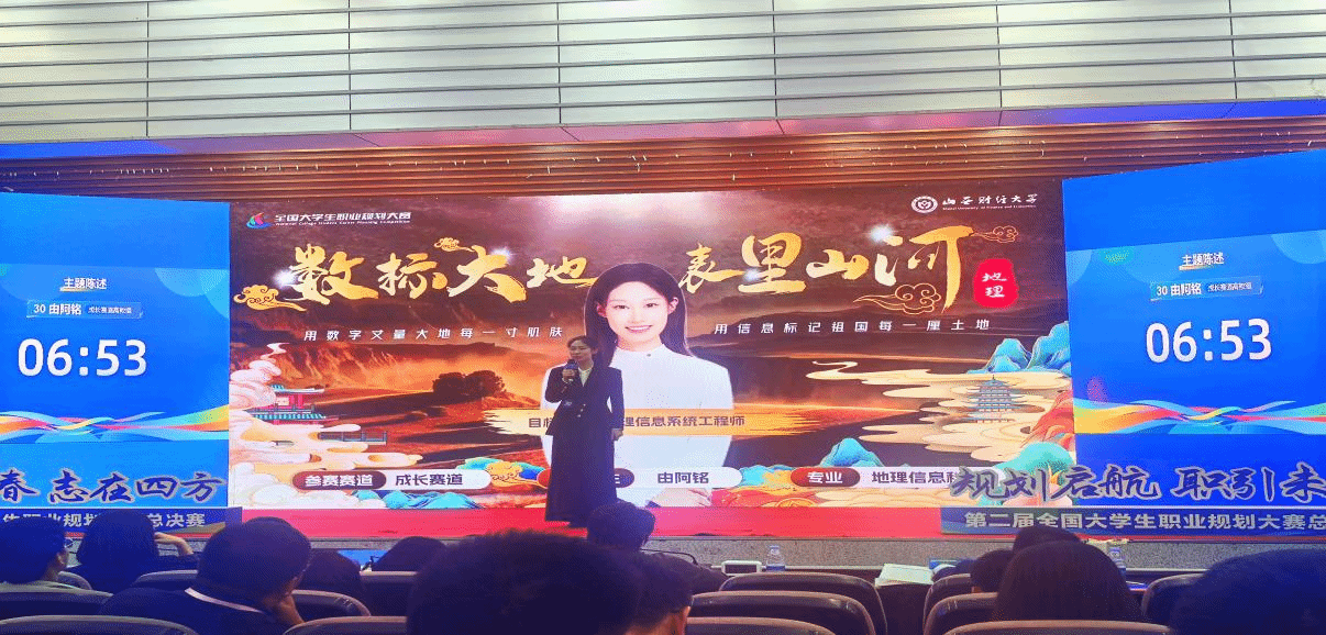 “我的理想看似平凡,就是做好每一份地理数据的守护者;我的理想实则宏远,要让神州大地的脉搏在数字世界里精准跃动。作为地理信息工程师,要勇担‘测天地经纬,绘民生蓝图’时代使命,用经纬交织的智慧构建数字孪生地球,让空间信息技术真正成为守护人类共同家园的科技基石。”在总决赛现场,由阿铭以“数标大地,表里山河——立志成为一名地理信息系统工程师”为规划蓝图,用数字丈量大地每一寸肌肤,用信息表记祖国每一厘土地。在主题陈述、评委问答、“天降 Offer”等环节中,沉着应答、展现了资环学子深厚的理论功底及丰富的实践经历,赢得各界高度认可。