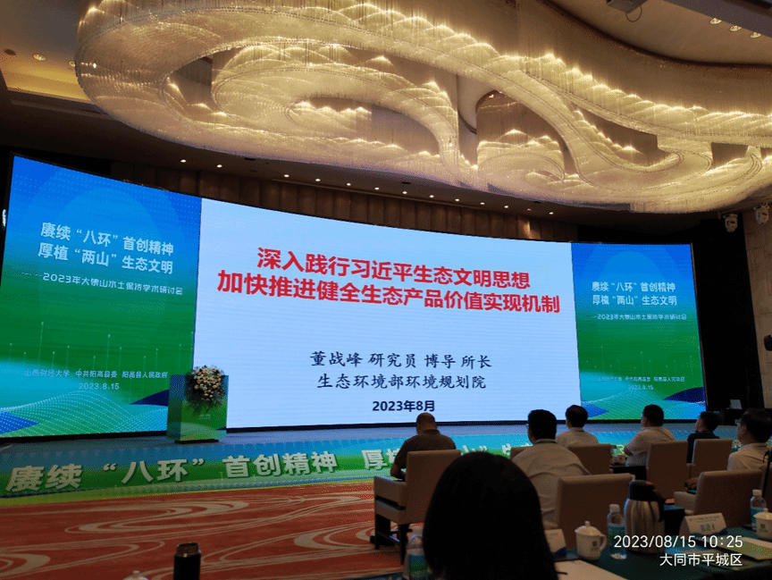 2023年8月15日上午,山西财经大学、中共阳高县委和阳高县人民政府联合主办的赓续“八环”精神,厚植“生态文明-2023年大泉山水土保持学术研讨会”上,腾讯欢乐斗地主下载 主板的“郦道元大讲堂”特别组织了“阳高县大泉山专场”,应会务组邀请,生态环境部环境规划院董战峰研究员作了题为“深入践行习近平生态文明思想加快推进健全生态产品价值实现机制”的主旨报告。